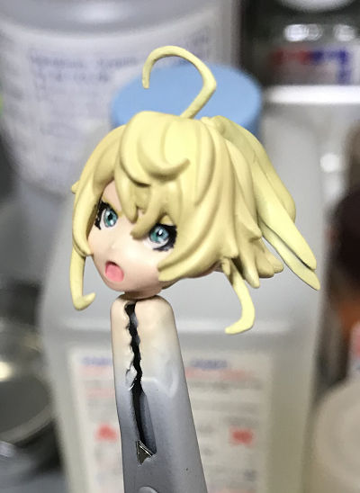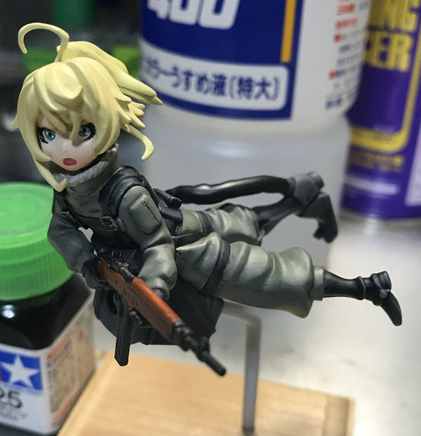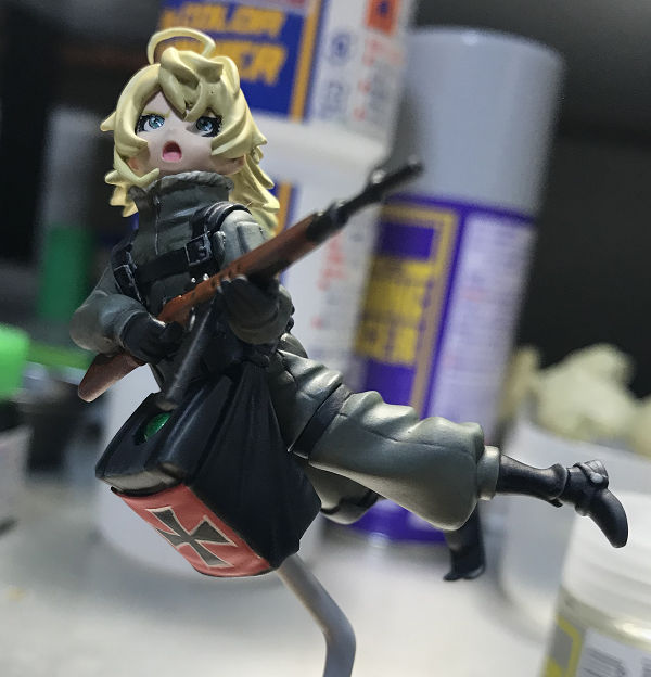 ターニャ・デグレチャフ完成!! ガレージキット 2019年10月22日 0 ナイトウモデルズ製 1/20「ターニャ・デグレチャフ」を作りました。劇場版「幼女戦記」を観ていたら作りたくなったので、押入れからサルベージ。 製作開始直後、バリ取り時に銃身を削り落とすミス・・・。部品が小さく、元通りに取り付けるのは無理・・・。作り直すことにしました。 フロントサイトは1㎜の穴をあけ、1㎜プラ丸棒を差し込んで接着して再利用。銃口は0.5㎜で穴をあけた。思ったより違和感なく作り直せました。 顔の塗装肌はラスキウスで塗装。目は、ブルー+ホワイト+イエローまつ毛は、ブラック眉毛は、イエロー+ブラウンパーツが小さい・・・視点が合わない・・・これが老眼か・・・。 髪の塗装前に、ラスキウスの新色を購入。髪の塗装専用塗料!!全色買ってみました。今回はブロンドを使用。 下地にクールホワイトベースにラスキウス ブロンドシャドウにGXクリアブラウン最後にクリアーホワイトクリアーホワイトでぼんやりした良い感じになるような気がする。眉毛がちょっと薄かった気がするが、もう修正できない・・・。 体は全て筆塗り。服はRLMグレー+デッキタン襟のモフモフはバフにフラットホワイトでドライブラシベルト類はフラットブラック右足はジャーマングレイ銃はデッキタンベースにダークブラウンで木目を書いて、一度ラッカーのクリアのクリア吹き乾燥後、ブラウンを薄く塗りそのあとクリアーオレンジをニスのように塗った銃身等は、フラットブラックで塗装後ガンメタルでドライブラシ箱?の赤は、サザビーレッド塗装後、リアルタッチマーカーで墨入れ。1/35のミリタリーフィギュア作ってるような気分になりつつ作業しました。このキットは小さいので、置き場所に困らず最高です!!別バージョンもあるみたいですが、もう手に入らないんだろうなぁ・・・。 PR