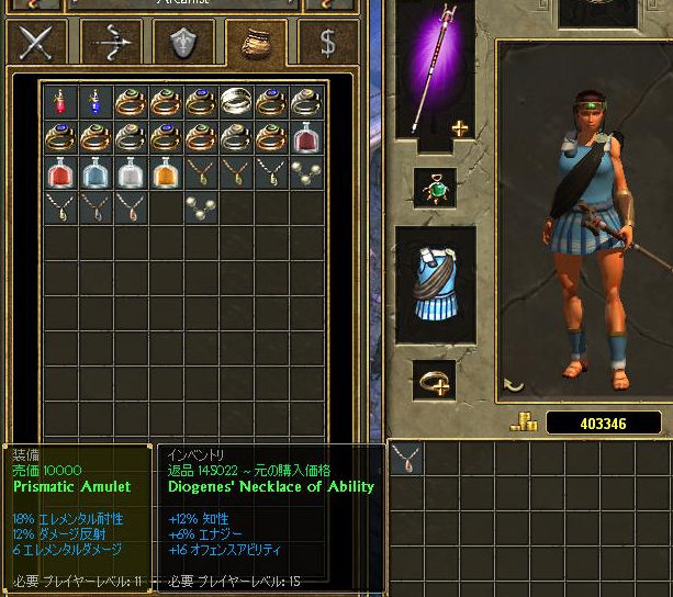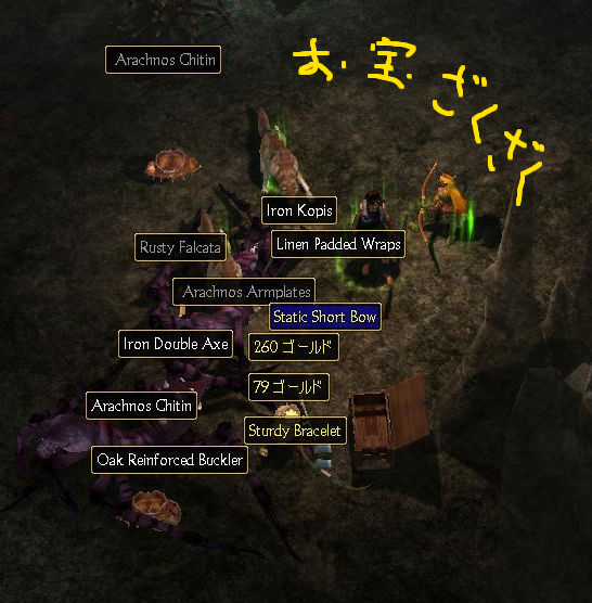 連休中!! ゲーム 2006年08月12日 0 デジカメのバッテリーが充電できなくなったので、ヨドバシカメラに買いに行ってきました。みつからなかったので、店員にバッテリーくれと言って出してもらいました・・・値段も聞かずに。数分後・・・「5980円になります」・・・・。工エエェェ(´д`)ェェエエ工「たけぇ~、なんだよ、その値段・・・」とか思いつつ、ポイント全部使用で買いました。バッテリーなんて、2000円ぐらいで買えるものだと思っていた、しもつかれです。_| ̄|○連休中、タイタンクエストを進めてみることに・・・。このゲームは、ディアブロ風なRPGです。現在、青いチアガール?でプレイ中・・・。装備品は、戦士系のほうが格好良いです・・・。そして、焚き火もあります・・・でも、踊れません。ビックリマークな人から、クエストを受けて冒険です。宝箱を開けると、お宝ざくざくで、レアアイテムも出まくりです。間違ってアイテムを買ってしまっても、返品可能!!売ってしまっても、買戻しができるので、うっかり屋さんにも安心です。英語版のゲームですが、誰かの作った日本語化ファイルを使用すれば、日本語で遊べます。チャットで日本語は使えませんが、半角カタカナなら表示可能っぽいです。ただ、全体的に動作不安定なので、ブルースクリーン多発の覚悟が必要です。(・∀・)ニヤニヤ互換モードで動かせば、ブルースクリーンは、ある程度避けられますがね・・・。