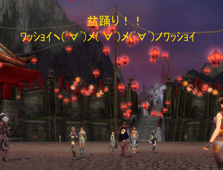盆ダンス ゲーム 2006年07月04日 0 ギルドウォーズのドラゴンフェスタも、明日7月5日午後4時に終わってしまいます。今日からかっこ悪いマスクの交換が始まりましたが、2時間おきに登場するNPC待ちって・・・。意味不明なイベントゲームの次に、花火とともに空から景品が降ってきました。物に群がる、人人人・・・。みんな、いつもどこに隠れているのかと思うくらい、いっぱい居ました。そして、久しぶりのネクロダンサーズ・・・崩壊前&焚き火がなつかしい。