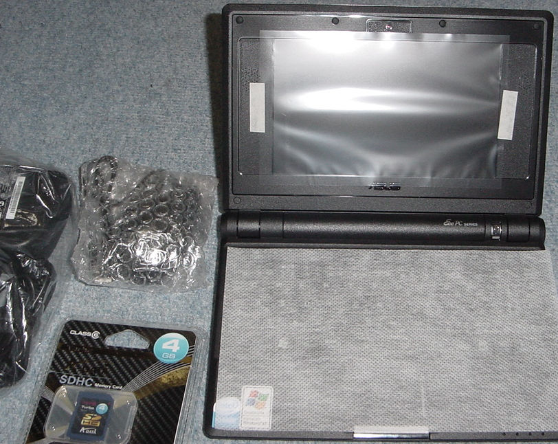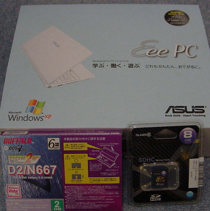 物欲暴走、EeePC購入!! 未選択 2008年01月27日 0 思わず買っちゃった・・・EeePC。黒は最後の1台だって言うから、つい魔が差した。貯まったポイントで、2GBのメモリと8GBのSDHCカードも購入。全部で、5万7000円ほど・・・。自分の我慢の無さにちょっと落ち込みつつ、開封。袋とUSBマウスとアダプタとSDHCカードが付属品か・・・マウスは、たぶん使わないな。液晶の保護シートが、ただのビニールを紙テープで留めてるだけなのには、ふいた。`;:゙;`;・(゚ε゚ )ブッ!!本体の大きさを、ギルドウォーズのパッケージと比べてみた。小さいよ、軽いよ。そして、裏側を見ると・・・。工エエェェ(´д`)ェェエエ工Windowsのシール破けとる・・・。店の展示品も破けてたけど、まさか破けてるのが仕様か・・・?あと、メモリスロットの蓋のネジ穴にも封印シールが・・・。店員さんの話だと、その封印シール剥がすと保障対象外になるそうです・・・。メモリ交換したら、保障対象外になるのかよ!!メモリ買っちゃったから、交換するけどね・・・保障無くなるんかな。(´・ω・`)ショボーンとりあえず、これから弄くってみる。ギルドウォーズ動くかな・・・?