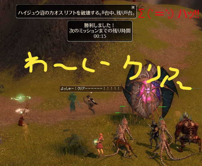 ドラゴンフェスタはじまた ゲーム 2007年07月07日 0 今日は、GMミッションお手伝いイベントが20:00からあるというので、GWに早めにINしていました。しかし、開始時間が「ドラゴンフェスタ」開始時間と重なり、多数決?の結果みんなで「ドラゴンフェスタ」に行く事になりました。そして、ドラゴンフェスタのイベントミッションにチャレンジ!!ヒーローをお供に突撃・・・即死せんせい!!クリアできる気がしません!!敵が、めちゃ強いです・・・。_ノ乙(、 冫、)_数回死亡後・・・鮪の刺身さんのお誘いで、PTに入れてもらいました。役に立たないRtなので、ついて行くだけになりそうです。(・∀・)ニヤニヤ次々と、敵を倒していくPTメンバー。そして、役に立たずに死んでいく自キャラ・・・。次々と拠点をクリア!!Σ('=';) ハッ!!拠点を3ヶ所クリアするまで、SS撮るの忘れてた・・・。_| ̄|○以下、4ヶ所目から。(;´Д`)4ヶ所目クリアー!!敵が地面から、わいてくるよ~!!墓にいる敵らしいのだけど、墓って1度しか行ったことないので、よくわかんね。(・∀・)ニヤニヤ敵強い・・・死ぬ・・・きつ・・・(;´Д`)ハァハァで、死亡・・・。その後、5台目クリア・・・SS撮り忘れ。んで、6台目クリア!!あれ?・・・なんか、増えてないか・・・残り6台??そして、7台目・・・工工エエェェ(´益`)ェェエエ工工ミッションクリアー!!って、残り8台・・・壊してないじゃまいか!!んで、次のミッションまでって・・・・まぁ、クリアしたってことで良しと・・・コバンザメ状態だったけど。( ̄ー ̄)ニヤリ強いPTメンバーに感謝感謝!!とても、楽しかったですよ。シンジェ訓練校にGMさんが居たので、表示の事をちょっと聞いてみた。GMさんは、表示がおかしいのは時差のせいだって、冗談で言ってたなぁ・・・。時差のせいじゃないけど、時差のせいってことにしておこう。GMさんと回る虫達・・・。そして、GMミッションお手伝いイベントがどうなったのかは、わかりません。