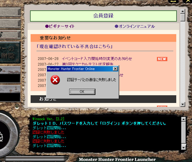 「モンスターハンターフロンティア」オープンβ開始!! ゲーム 2007年06月28日 0 今日から、「モンスターハンターフロンティア」のオープンβが始まりました!!早速INするべく、クライアント起動!!!ID&パスワード入力!!!!ドキドキわくわく!!!!!!・・・・工工エエェェ(´益`)ェェエエ工工ぜんぜんログインできないんですけど・・・(´・ω・`)ショボーンそういえば、昨日までやっていた負荷テストも一回もログインできなかったなぁ・・・ダメじゃん。ヽ(`Д´)ノウワァァァン今夜は、ギルドウォーズのGMイベント「だるまさんがころんだ」第2回だな・・・。シンジェ訓練校6月28日(木)22:30~30分ぐらいだそうな・・・また参加しよう。
