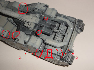 ヒルドルブ完成・・・そして。・゚・(ノД`)・゚・。 模型 2007年04月30日 0 ゴールデンウィークの連休に突入デス。_|\○_ ヒャッ ε= \_○ノ ホーウ!!!日曜日は天気が良かったので、ヒルドルブの塗装をしてみました。戦車模型の要領で、塗装開始!!黒立ち上げで、グリーン部分:RLM02グレー+ダークイエローブラック部分:ジャーマングレー塗装後、ジオンのエンブレムのドライデカールのみ張りつけエナメルのフラットブラック+ジャーマングレー+ブラウンで、ウォッシングエナメルのバフで、ドライブラシ最後につや消しトップコートを、全体にかけました。しかし、エナメルでのウォッシングをやったせいで、可動部分がことごとく折れました・・・。(゚益゚;)ABSのパーツが一つも無いのに、なんで折れるんだよ・・・バンダイの陰謀か・・・。_| ̄|○赤丸のところが、全部折れてますよ。ヽ(`Д´)ノウワァァァンもう、このヒルドルブはモビル形態になれません・・・。(´・ω・`)ショボーンとりあえず、ヒルドルブ完成!!