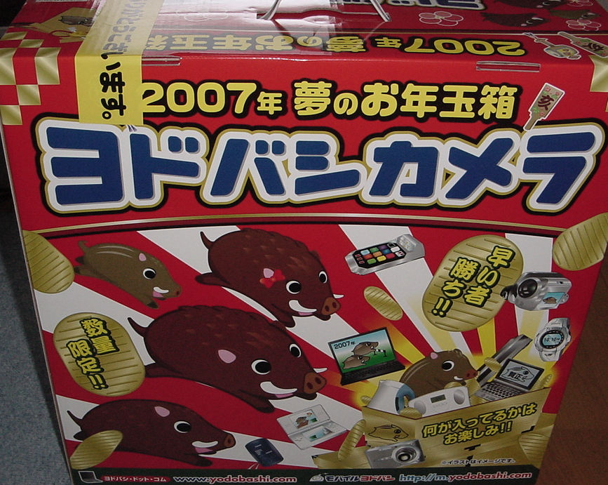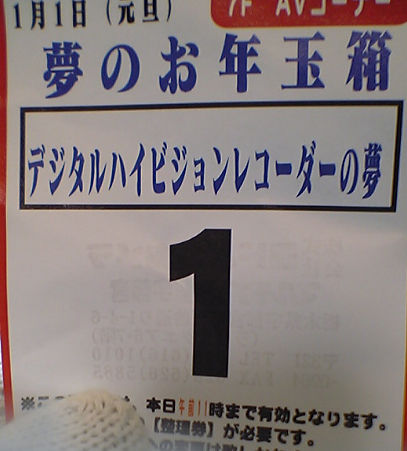 いつのまにか明けましたおめでとう!! 未選択 2007年01月01日 1 2007年1月1日・・・福袋を買いにヨドバシカメラ宇都宮へ!!AM0:30 初詣の帰りに、ヨドバシ入り口を確認。まだ誰も居ないようだ。一旦家に戻り睡眠。AM4:30 買えるか不安になったので、早めに起床。準備して出発。AM5:00 ヨドバシ宇都宮到着。入り口に椅子と手袋が置いてある・・・誰か居るようだ。自分は2番目のようだ。しかし、人の気配無し・・・。AM5:30 いまだ人影無し・・・。警備員に不審者と思われ、何してるのかと尋ねられる・・・。_| ̄|○AM6:00 椅子の持ち主いまだ現れず。3人ほど列に加わり、誰か分からぬ椅子の人と自分合わせて5人になる。AM6:30 椅子の人も現れ、5人の列が続く・・・寒い。椅子の人は、AM3:00に来たそうな・・・。ヨドバシ警備員登場、割り込み防止の為ノートに購入商品の確認を書き込んでいく。しかし、椅子の人はデジカメ福袋を頼んでいた・・・。少しづつ人が増えていくが、まだ10人も居ない・・・。AM7:00 もっとゆっくり来ても平気だったのではないかと、鬱になる・・・。_ノ乙(、 冫、)_かなり寒い・・・足がしびれてきた。AM7:30 気が付くと、30人ほどの列になっていた。人少なすぎ・・・近くに並んでる人が、ヨドバシ宇都宮は穴場だと言っていた。しかし、ハイビジョンレコーダー福袋は、この時点で完売。AM8:30 無言のまま寒さに堪えていると・・・。ヨドバシの店員が現れるが、整理券の配布はまだのようだ。AM9:15 遂に整理券の配布・・・でも、開店15分前かよ・・・。整理券渡されたが、その場を動くなとの警備員からの指示。先頭に並んでいた人が、ハイビジョンレコーダー狙いでは無かった為、私が1番整理券をもらった。デジカメ福袋は、開店直前でも余っていたよ・・・椅子の人。AM9:30 ヨドバシ宇都宮開店。4時間半並んでやっと購入。当りかハズレか・・・ドキドキ。RD-E300キタ━━━━(゚∀゚)━━━━!!当りのようだ、正月から良い買い物させてもらった。レコーダーのセットも終わったので、寝よう・・・。あ、てづか模型行ってねぇや・・・。_| ̄|○