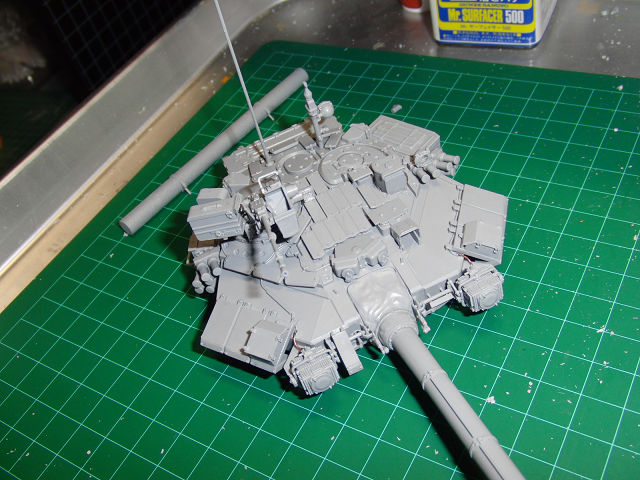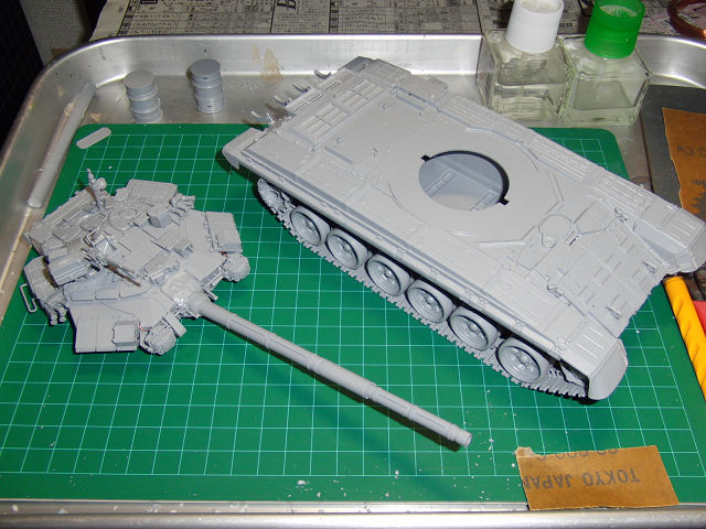 T-90制作続行中 模型 2012年03月11日 0 やっと砲塔が組み上がりました。クリアパーツは塗装してしまおうかと思っていますので、全部組み付けました。作業途中にアンテナが折れたり、機銃が取り付かなかったりしました・・・。とりあえず作業台を掃除して、次は車体だ!!